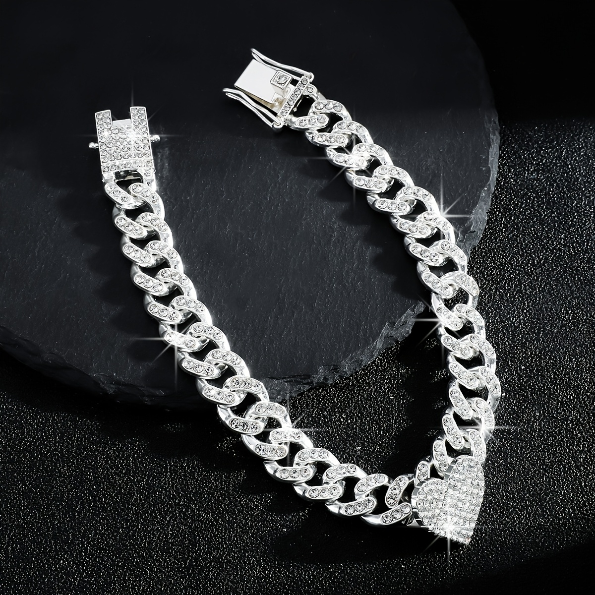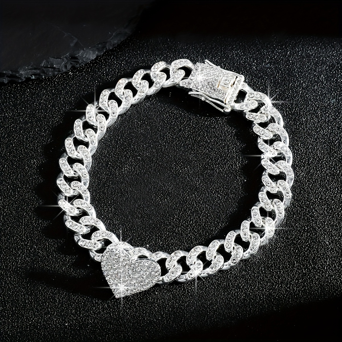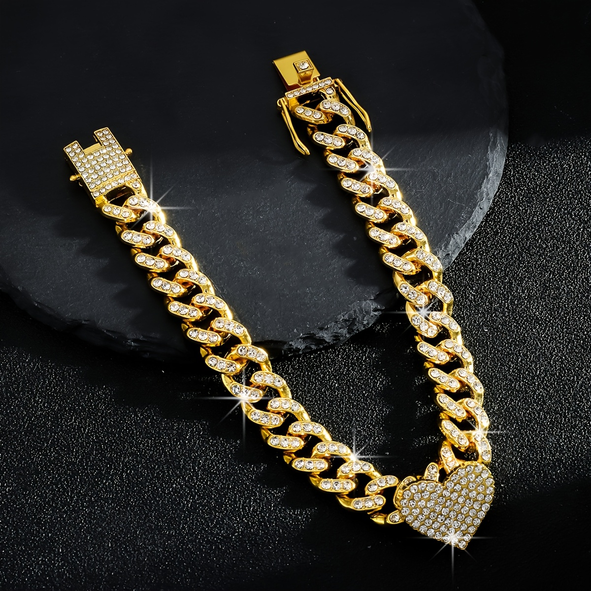 1pc Iced-Out Rhinestone Heart Anklet - Luxurious Golden Cuban Link Chain with Sparkling Stones for Women, Perfect for Casual Attire or Parties, Party Accessories | Heart Charm Anklet | Highquality Jewelry, Heart Jewelry