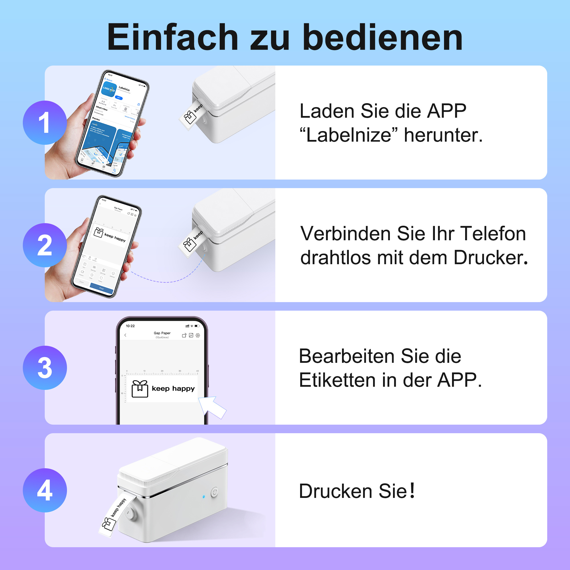 · It's simple and fast. The P31S label printer can be used with one hand. Setup can be completed in one minute. 1. Download the Labelnize app or scan the QR code. 2. Peel and stick the label printing ribbon. 3. The app connects wirelessly to the P31S. 4. Choose your favorite template with this mini label printer and start your fun printing journey